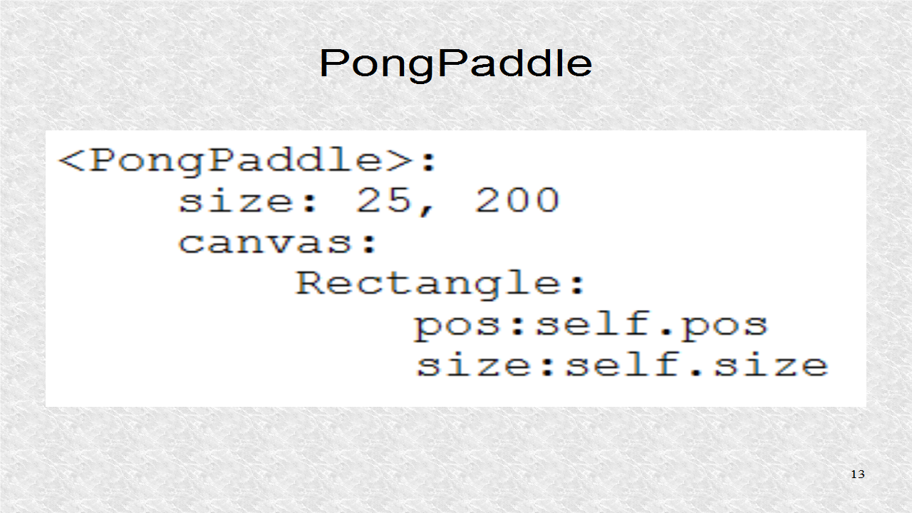 In the kv file, the first line is a regular comment and the second line is a directive that we are running a Kivy version of at least 1.0.9. The size and shape of the PongBall is specified as a circle.